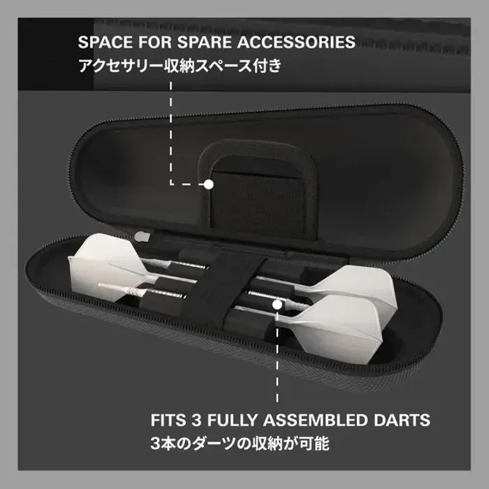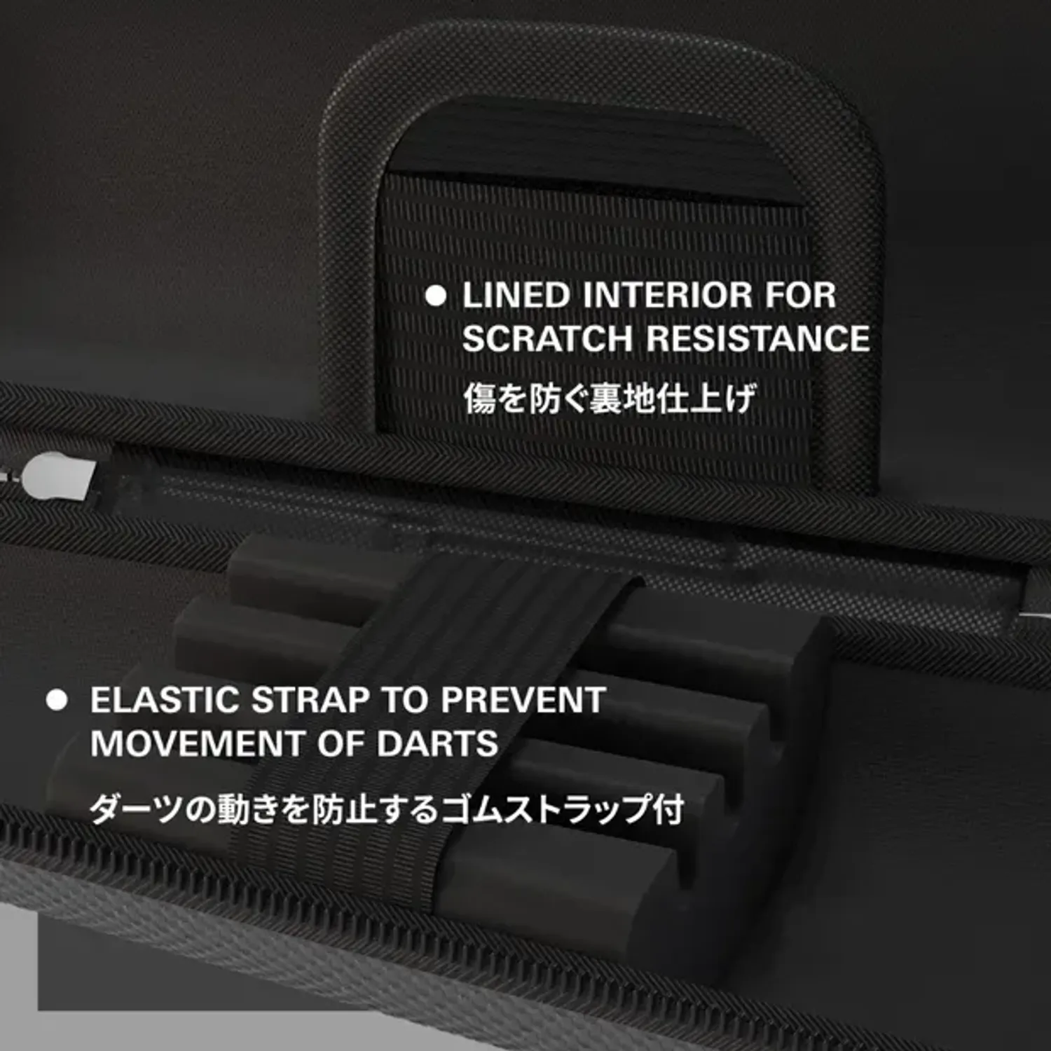 Доторх уян туузан бэхэлгээ нь бүрэн угсарсан 3 ширхэг дартсыг найдвартай тогтоон, тээвэрлэлтийн үеийн хөдөлгөөнийг багасгана. Бат бөх, хатуу бүрхүүлтэй хийц нь K-Flex хэвтэй далавч болон бусад хэрэгслийг хийх хангалттай зайтай. Доторлогоо нь зурааснаас хамгаалсан материалаар хийгдсэн бөгөөд таны хэрэгслийг тоглолт хооронд төгс хамгаална.
