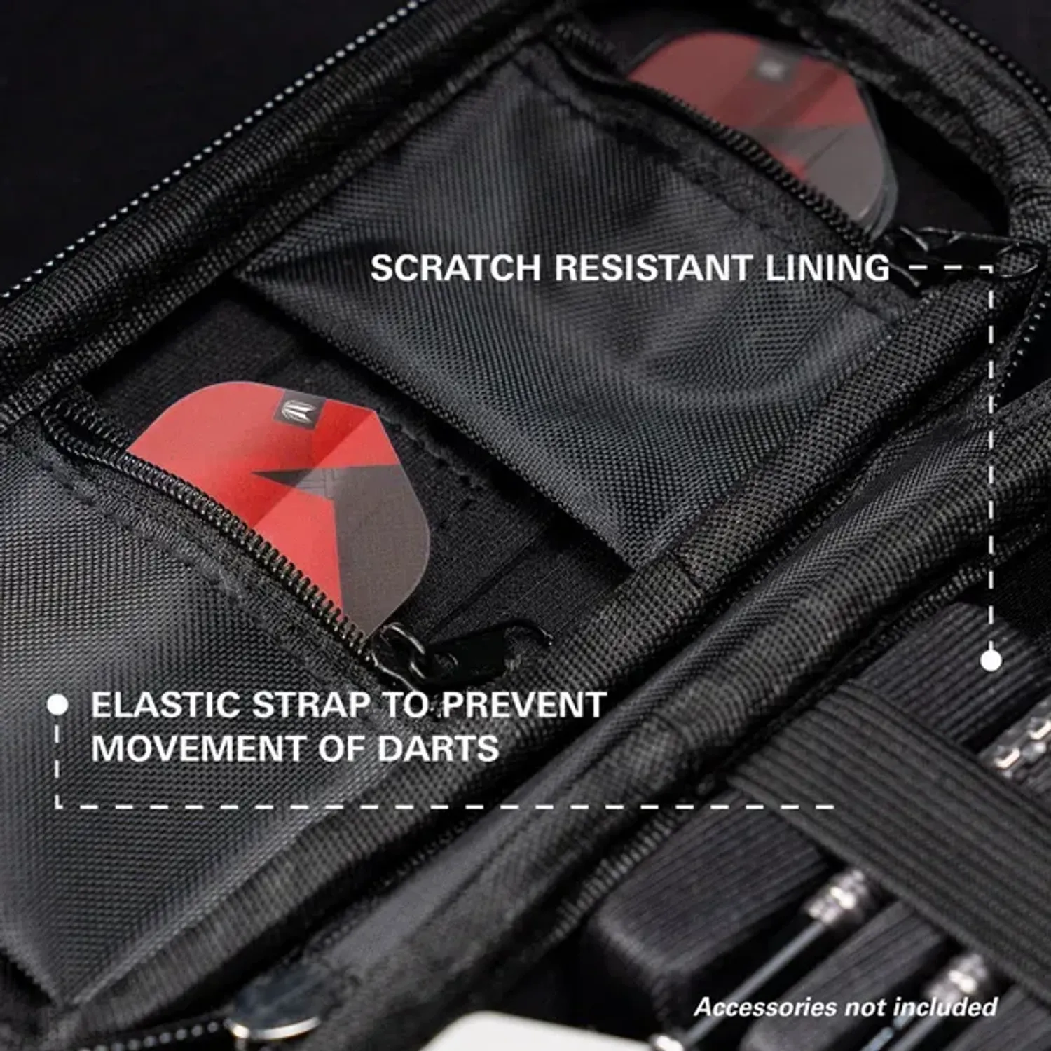 Мөн энэхүү хайрцаг нь хоёр ширхэг цахилгаантай тусдаа халаастай бөгөөд нэмэлт хэрэгслүүд (flight, shaft, point эсвэл Swiss Point багаж гэх мэт)-ийг эмх цэгцтэй хадгалж, ширүүн тоглолтын үеэр ч амархан авч ашиглах нөхцөлийг бүрдүүлдэг.