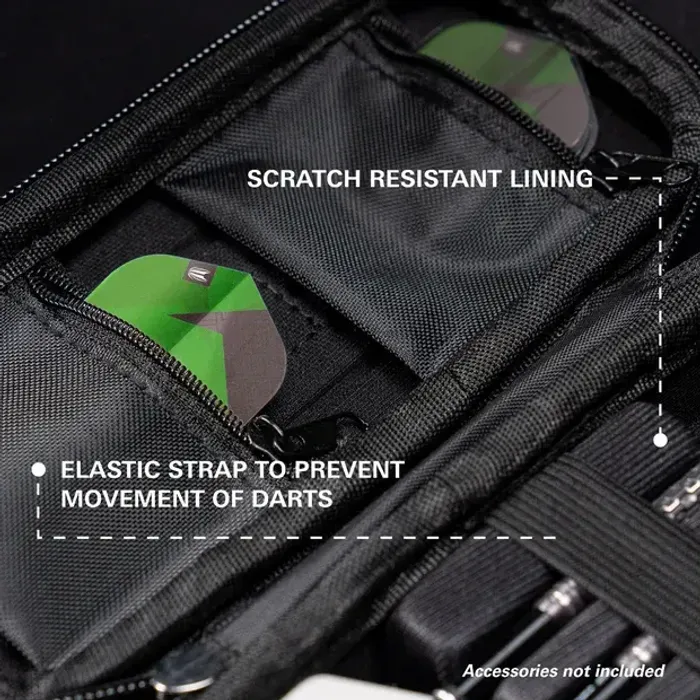 Хайрцаг доторх уян бүс нь гурван ширхэг бүрэн угсарсан дартсыг хөдөлгөөнгүйгээр бат бөх тогтоож, тээвэрлэх үед хөдөлгөөнөөс сэргийлнэ. Дотор тал нь хилэн бүрээсээр хийгдсэн тул зөөлөн мэдрэмжтэй, зурааснаас хамгаалж, таны дартсыг төгс байдалд хадгална. Авсаархан хийц нь дэгжин төрхийг нэмэхээс гадна сонирхогч болон мэргэжлийн тоглогчдод адилхан тохиромжтой.