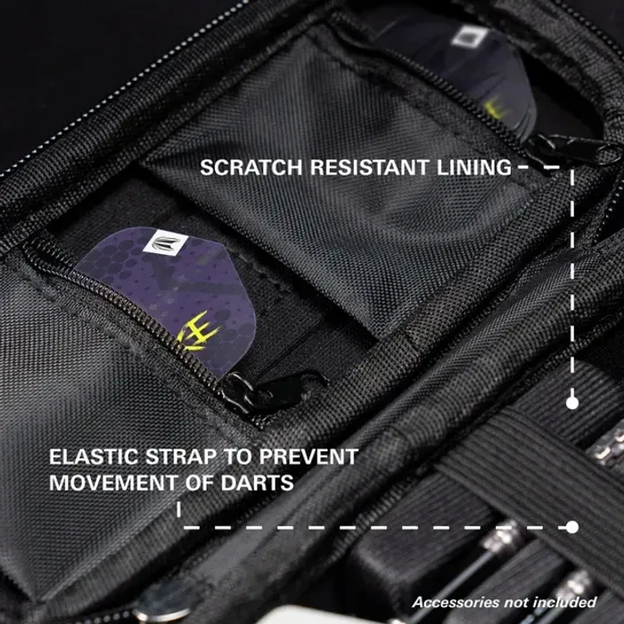 Дотор тал нь зурааснаас хамгаалагдсан бүтэцтэй бөгөөд бүрэн угсарсан 3 ширхэг дартс багтаана. Мөн тусдаа цахилгаантай халааснууд нь нэмэлт далбаа, шилбэ, Swiss Point, эсвэл Swiss Point-ийн багаж хийх зориулалттай.