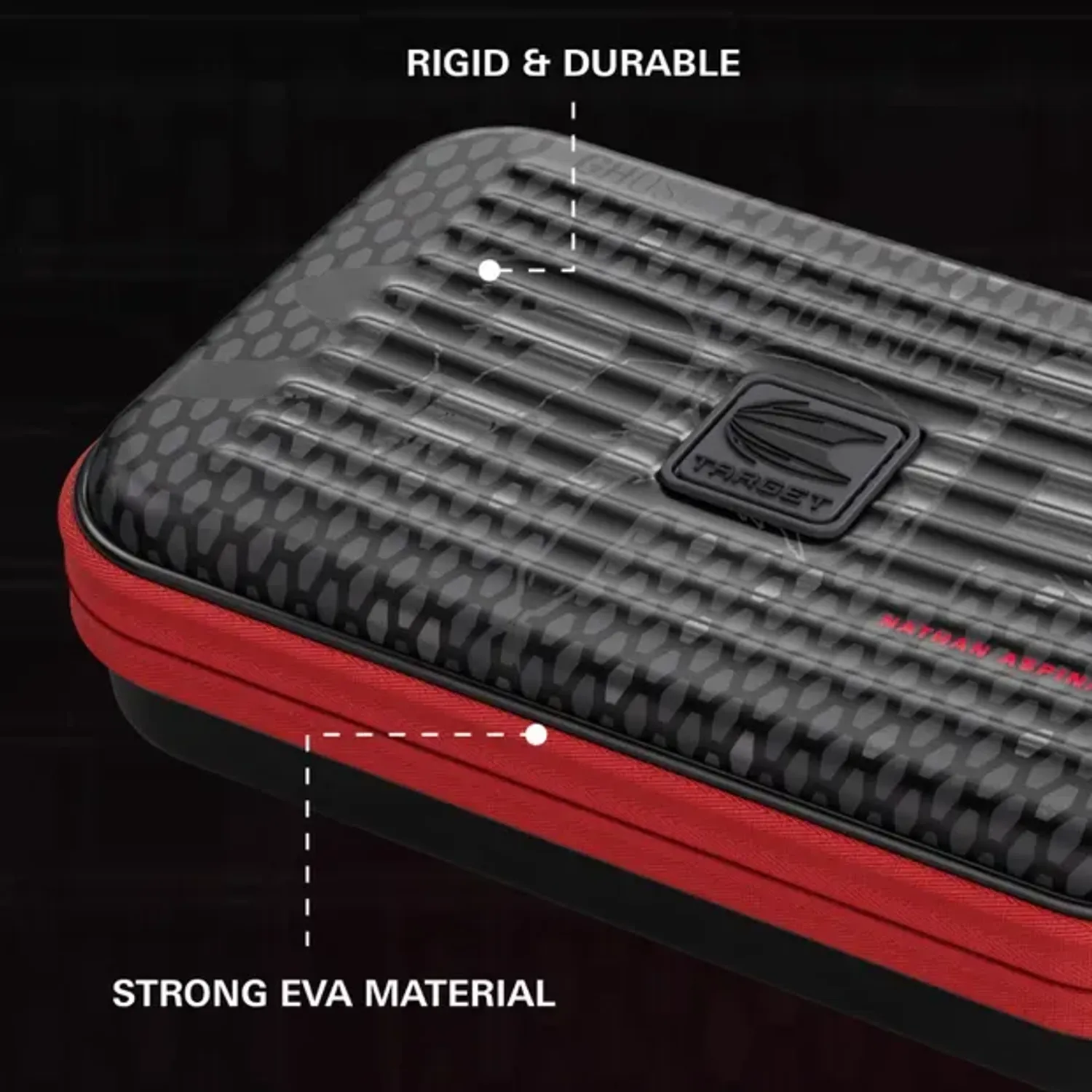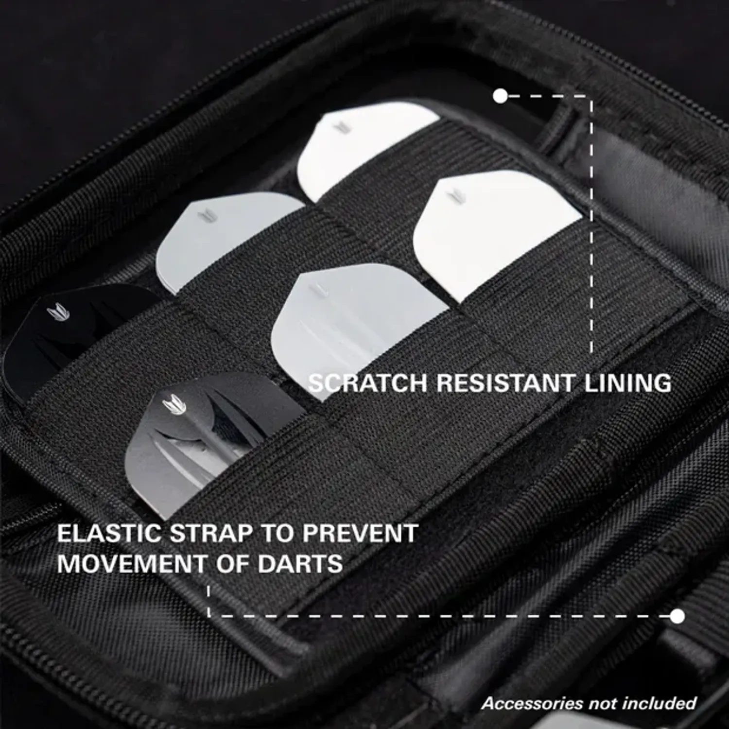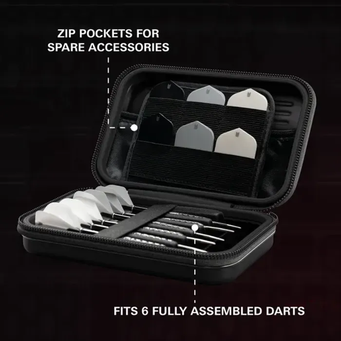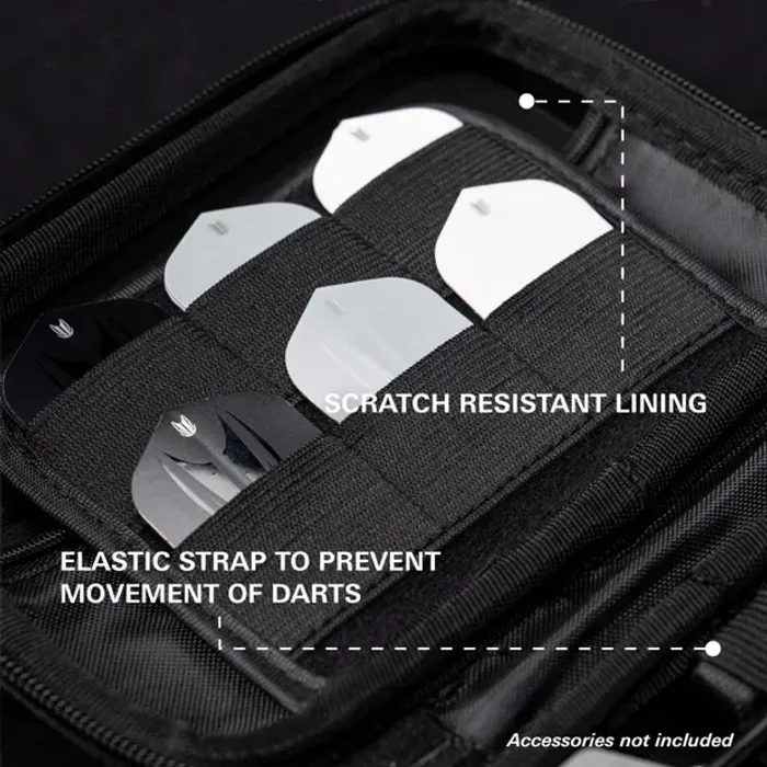 Дотор тал нь зурааснаас хамгаалагдсан бүтэцтэй бөгөөд бүрэн угсарсан 6 ширхэг дартс багтаах боломжтой. Мөн илүү том тасалгаанууд нь нэмэлт далбаа, шилбэ, Swiss Point, Swiss Point-ийн багаж хадгалах хангалттай зайтай.