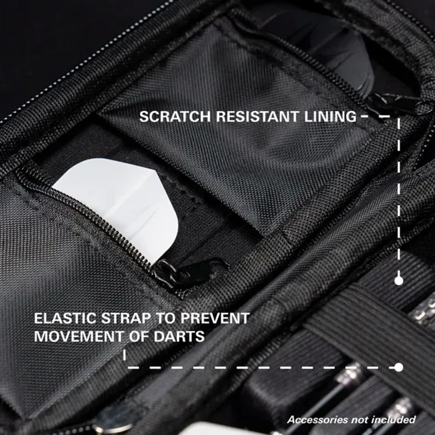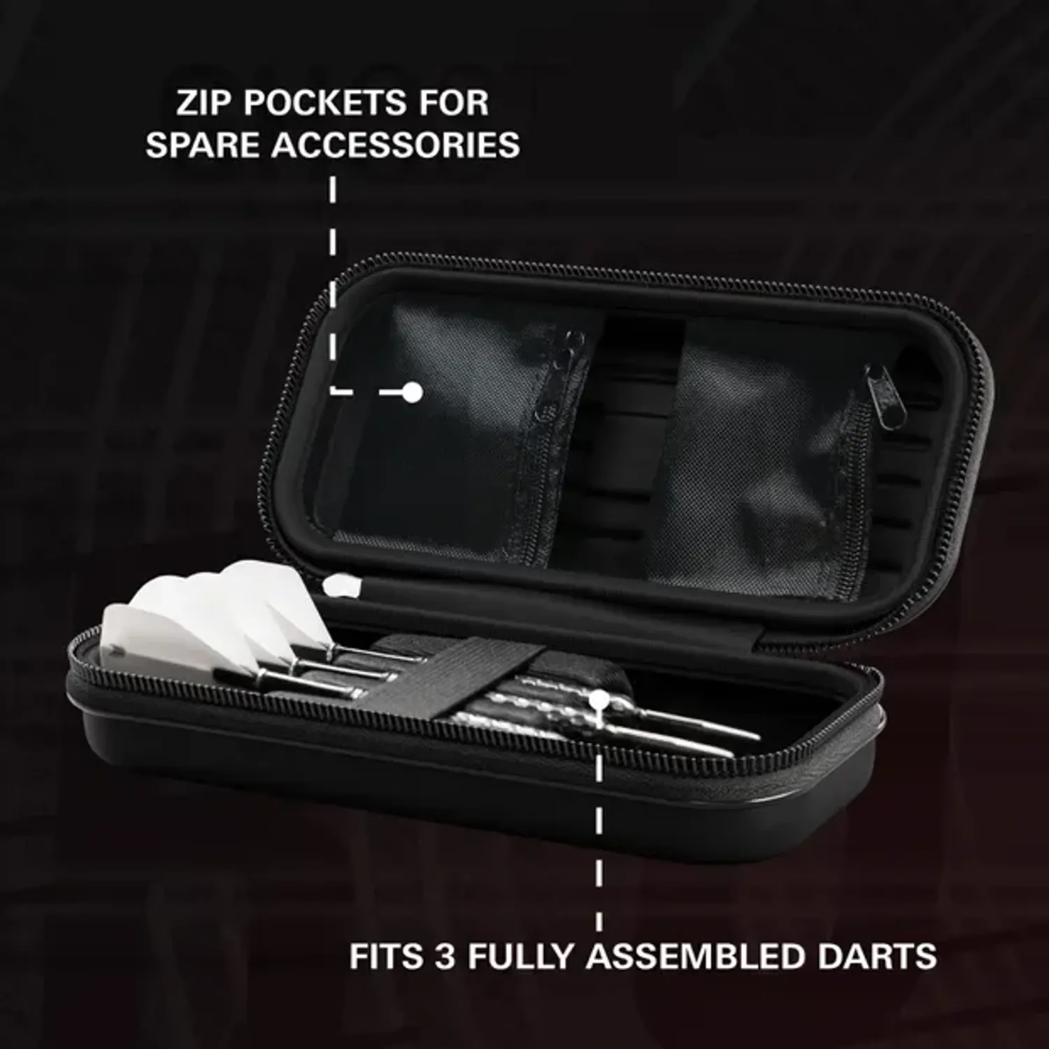 Хатуу гадаргуутай тул дартсыг найдвартай хамгаална. Дотор тал нь 3 бүрэн угсарсан дартс багтаах боломжтой. Мөн цахилгаантай хэсэгт далбаа, шилбэ, Swiss Point болон хэрэгсэл хадгална. Загвар, ажиллагаа, Stephen Bunting-ийн эрч хүчийг хослуулсан дээд зэрэглэлийн кейс.